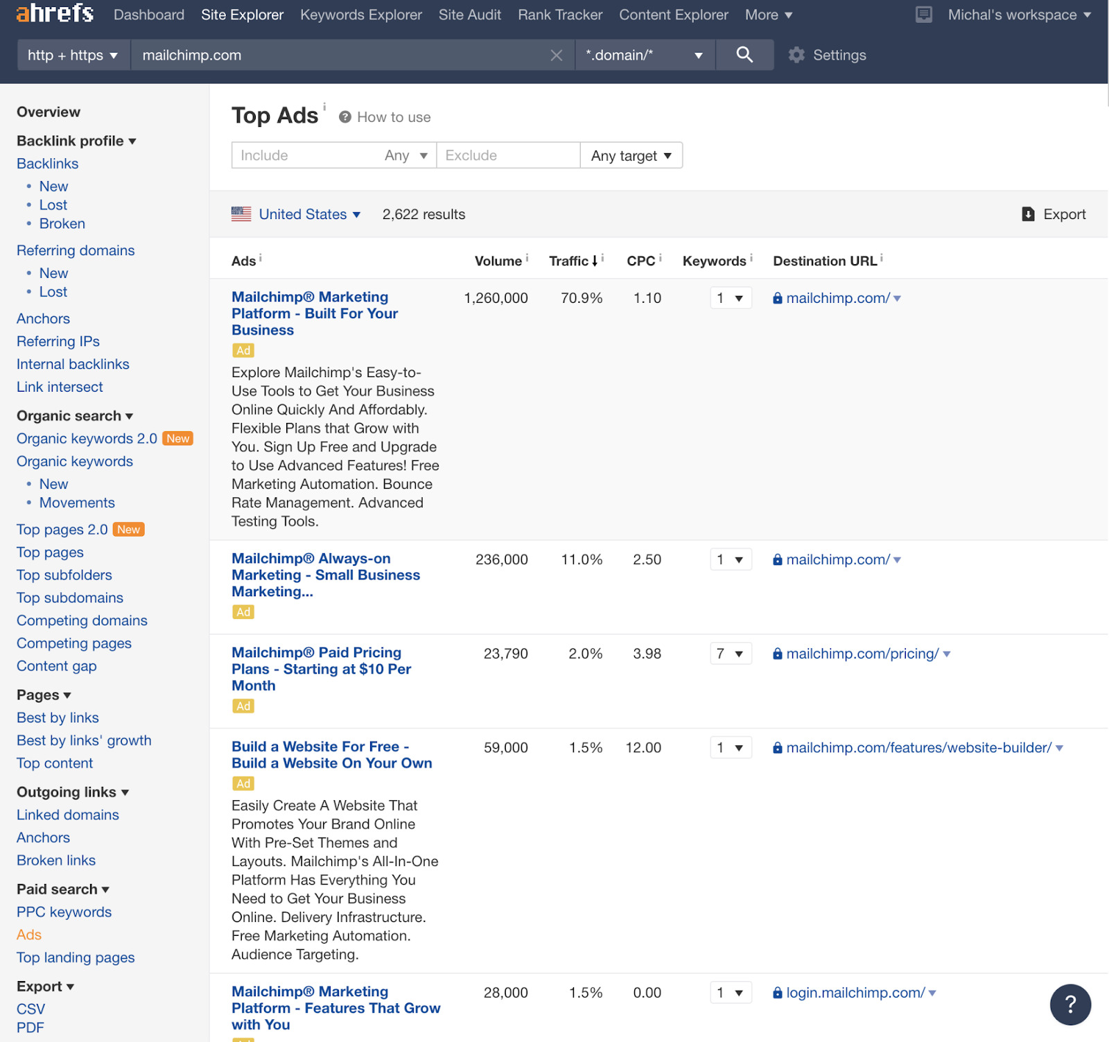 Anzeigen bieten auch nützliche Einblicke. Sie haben keinen Platz für Floskeln, was sie zu einem großartigen Ort macht, um etwas über die Positionierung eines Unternehmens zu erfahren. Um anzufangen, schaue dir ihre Suchanzeigen an. Das kannst du tun, indem du auf den Anzeigenbericht unter dem Reiter Bezahlte Suche im Site Explorer.