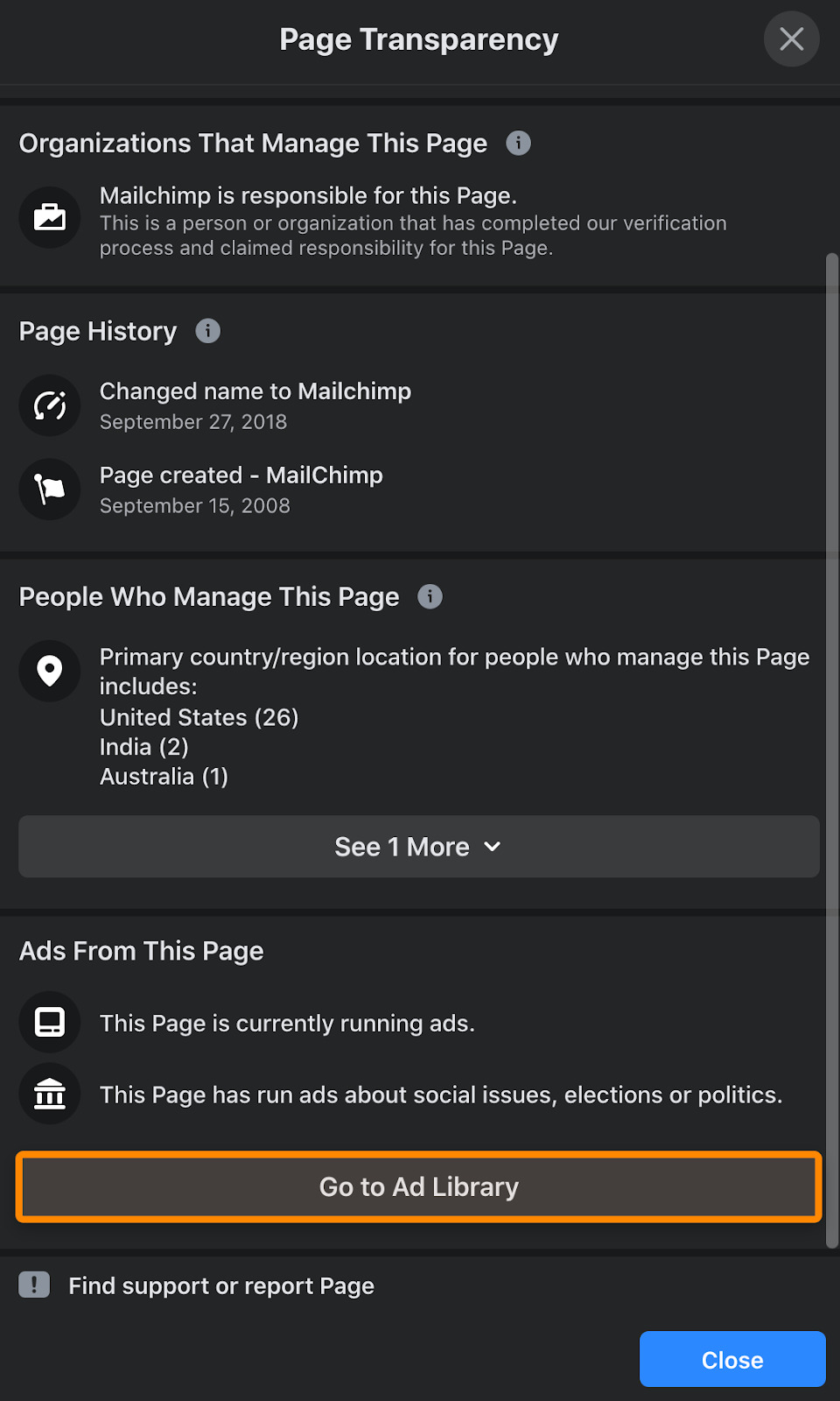 Du kannst die Facebook-Werbeanzeigen sehen, die jedes Unternehmen schaltet, wenn du seine Seite besuchst. Scrolle einfach zur Seitentransparenz und klicke auf „Alle anzeigen“:
