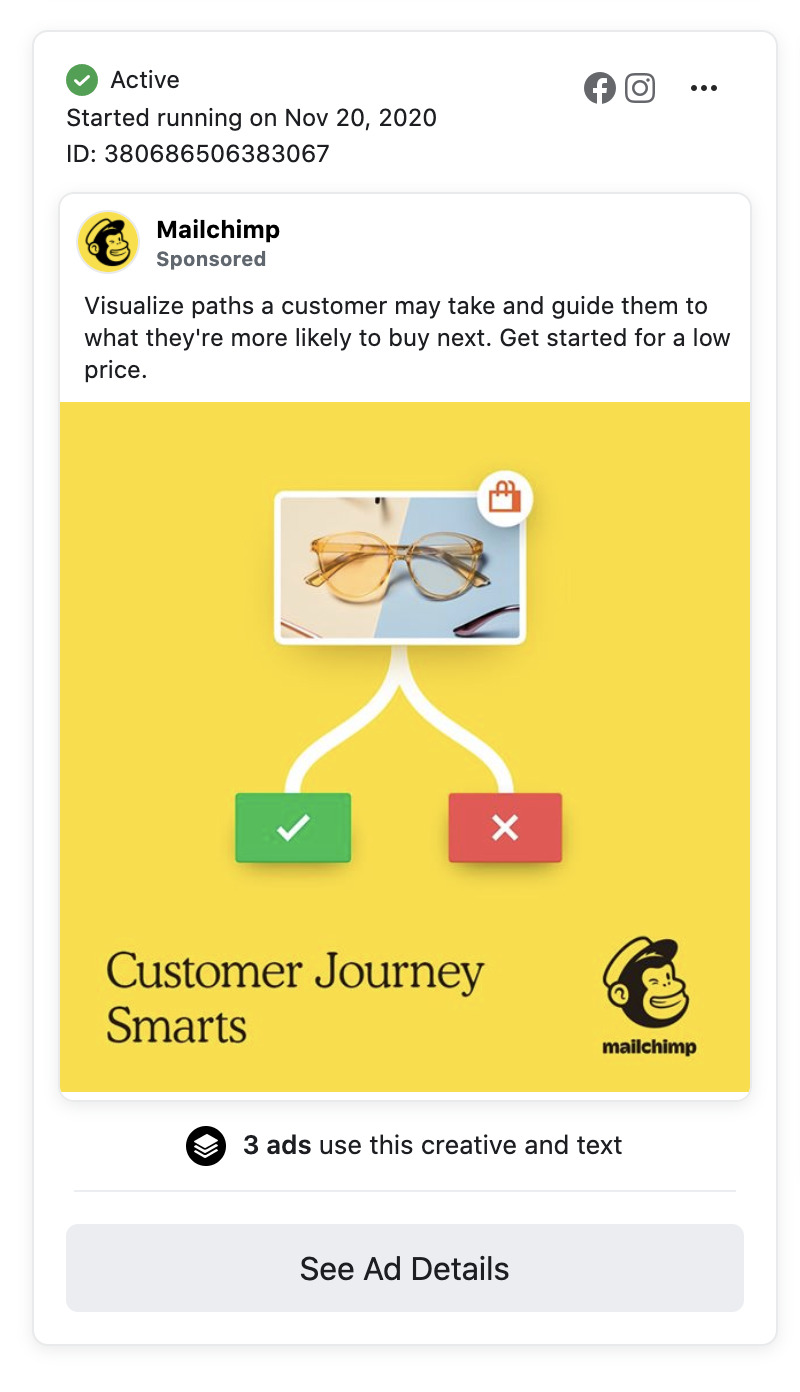 Mailchimp macht hier einen großartigen Job. Ihr Logo – ein Affe auf gelbem Hintergrund – ist ziemlich ikonisch. Der Affe namens Freddie ist auch ihr offizielles Maskottchen und hat sogar seine eigene Fanpage. MailChimp nutzt diese unverwechselbaren Assets konsequent in ihrem Marketing, wie du an dieser Facebook-Anzeige sehen kannst: