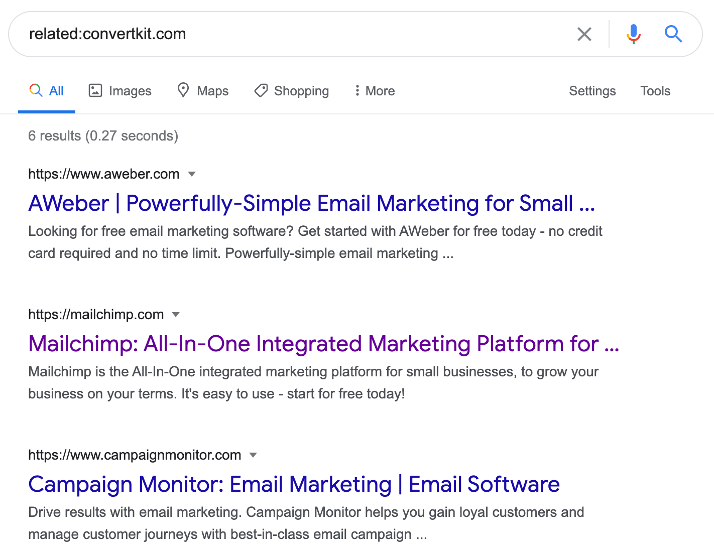 Dieser Suchoperator findet Seiten, die mit einer bestimmten Domain verwandt sind. Er funktioniert gut, aber der Nachteil ist, dass er normalerweise nur eine Handvoll verwandter Seiten findet. In diesem Fall sind es MailChimp, Aweber, Campaign Monitor und drei weitere.