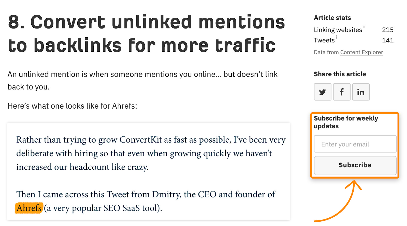 Die einfachste Möglichkeit ist es, etwas als Gegenleistung für das Abonnieren anzubieten. Bei Ahrefs halten wir es einfach, indem wir anbieten, mehr von den Inhalten, die ihnen gefallen haben, direkt in ihren Posteingang zu liefern.
