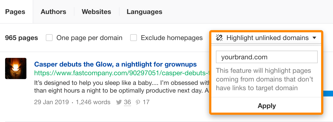 Klicke dann auf den Filter “Unverlinkte Domains hervorheben” (“highlight unlinked domains”) und füge deine Domain hinzu. Dies wird dir Seiten zeigen, die derzeit nicht auf dich verlinken.