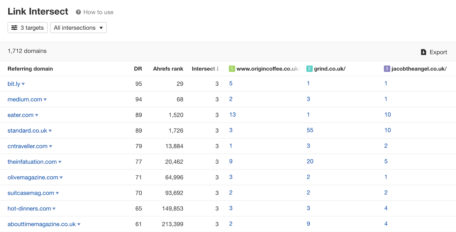 Eine andere Methode ist die Verwendung von Ahrefs Link Intersect. Link Intersect zeigt an, welche Seiten auf mehrere Konkurrenten verlinken, aber nicht auf dich. Das kann dir helfen, Verzeichnisse zu finden, in denen deine Konkurrenten bereits gelistet sind, du aber nicht.
