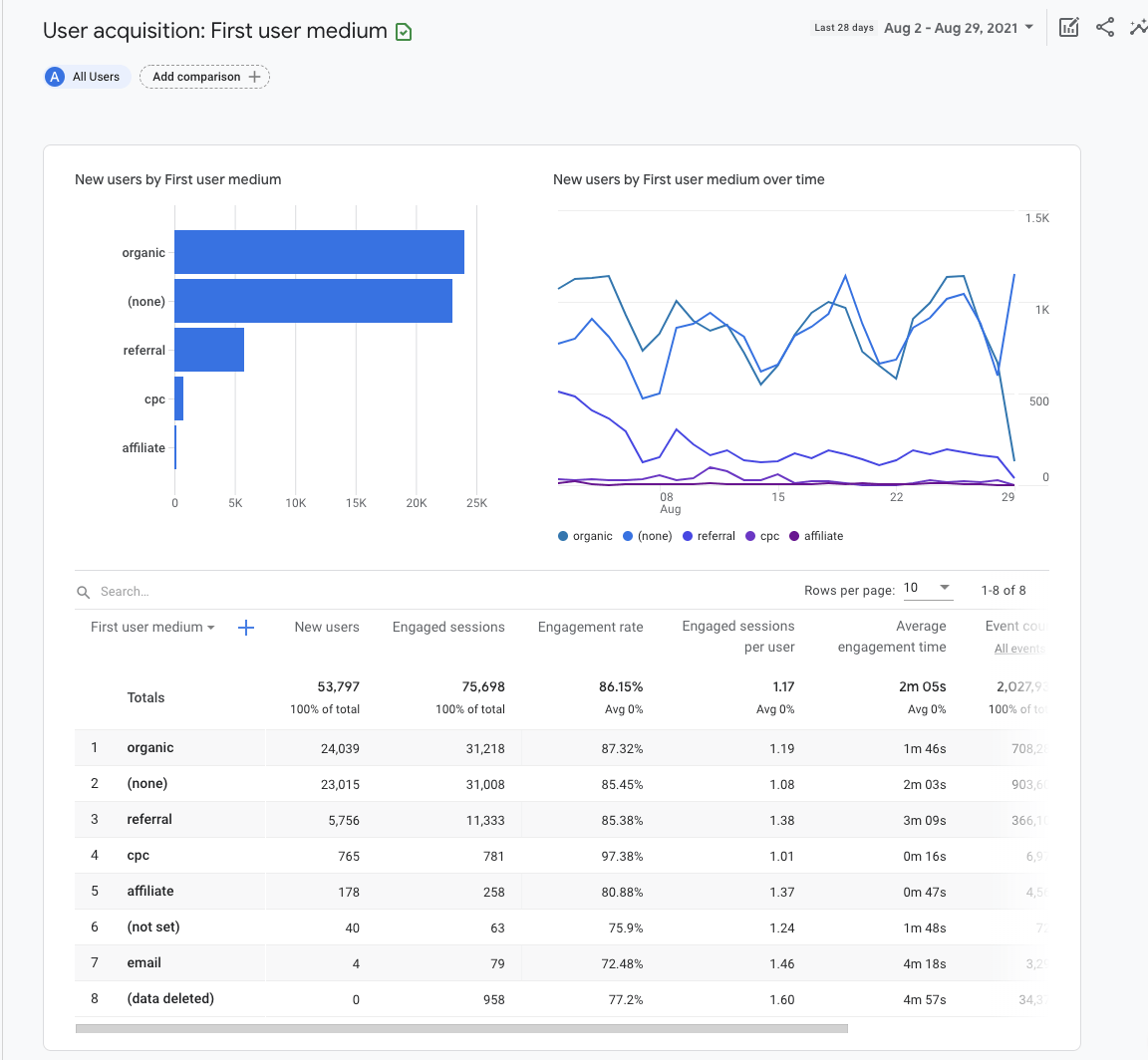 Im obigen Beispiel haben wir “Erstes Nutzermedium” als Dimension in der ersten Spalte der Tabelle gewählt. Dies zeigt uns die Quelle, über die die Nutzer zuerst gewonnen wurden. Zum Beispiel fasst “organisch” den Traffic aus allen organischen Quellen zusammen: Google, Bing, Yahoo, etc.