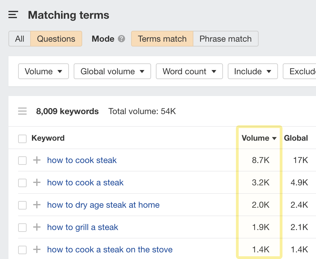 Generally speaking, the higher the search volume, the higher the traffic potential of the topic.