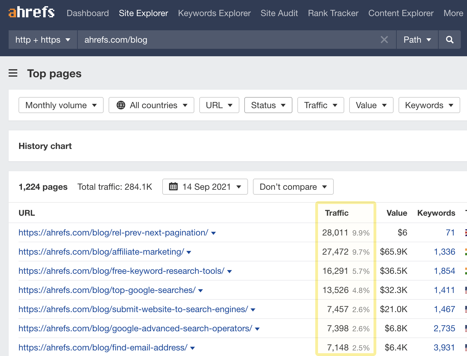 Use Ahrefs’ Web Analytics to identify your most viewed content. If you don’t have an analytics software set up, you can use the Top Pages report in Site Explorer for a rough idea: