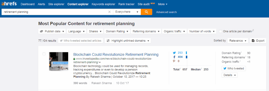 We started by dropping “retirement planning” into Content Explorer, which gives us about 77,000 results.