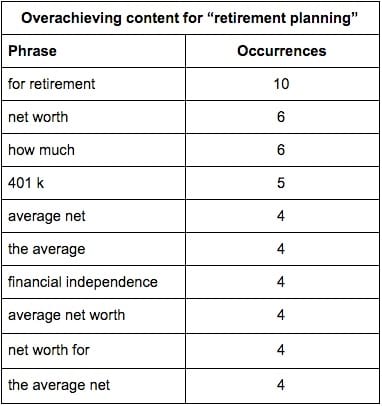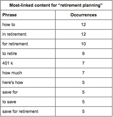 For example, if I look at the most common words and phrases of the top content ordered by referring domains (the traditional approach), the analysis suggests I should create content on “how to save for retirement”: