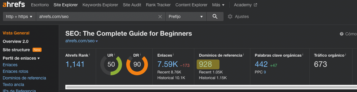 En primer lugar, introduce la URL la página que intentas posicionar en el Explorador de Sitios de Ahrefs y verás cuántos enlaces y dominios de referencia (sitios webs que enlazan) tiene actualmente tu página.