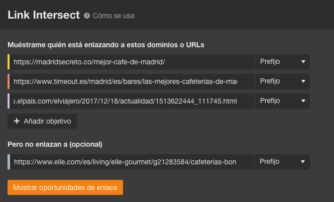 Si quieres profundizar más en la comprensión del panorama de enlaces de tus palabras clave objetivo y el tipo de enlaces que necesitas para posicionar, revisa los dominios que enlazan a todos tus competidores, excepto a ti. Para hacer esto, introduce los tres competidores mejor posicionados en tu palabra clave objetivo en la herramienta Link Intersect (intersección de enlaces) y tu página en “Pero no enlazan a”, así: