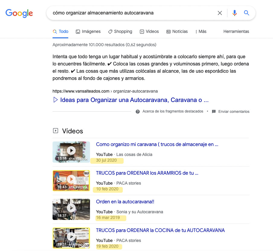 Sin embargo, si buscas un tema que no tiene que actualizarse con tanta frecuencia, la novedad no tiene un peso tan influyente. Por ejemplo, los resultados mejor posicionados de “cómo organizar almacenamiento autocaravana” son de hace dos o tres años: