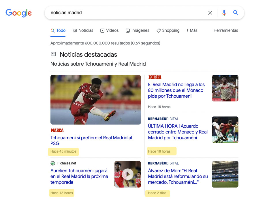 Este factor importa más en unas búsquedas que en otras. Por ejemplo, si buscas algo relacionado con noticias, Google normalmente posicionará resultados publicados en las últimas 24 horas.