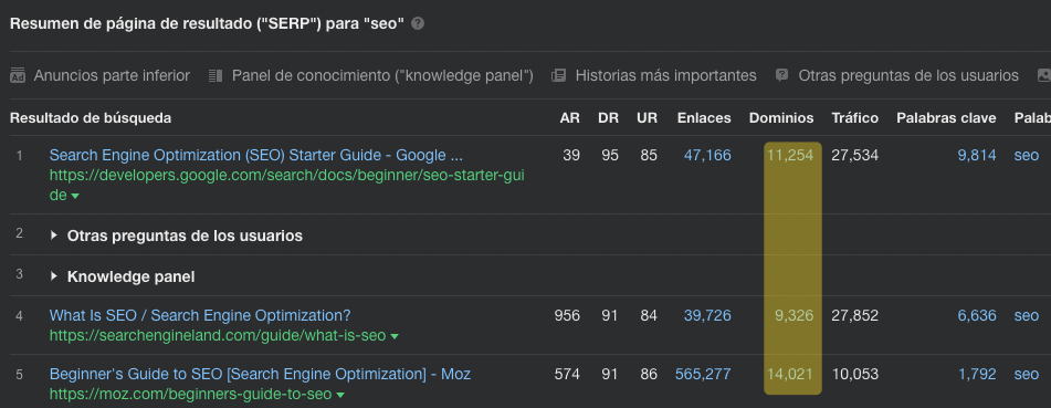 Si ves que las páginas de tus competidores tienen más enlaces que la tuya (como nos pasa a nosotros en el ejemplo de arriba), quiere decir que probablemente tengas que priorizar el conseguir enlaces para posicionar por encima de ellos.