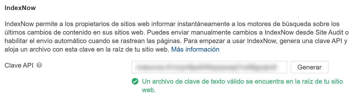 De lo contrario, puedes enviar páginas manualmente a IndexNow pegando la clave API de IndexNow (disponible en la configuración del proyecto) en el directorio raíz de tu sitio web.