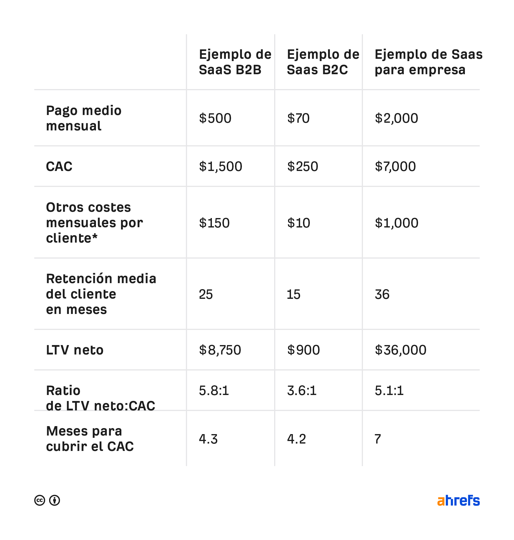 Es intuitivo tomar el gasto mensual en marketing y ventas y dividirlo por el número de nuevos clientes que has conseguido ese mes. También hice eso en los ejemplos. Pero esto solo puede funcionar si tu gasto es de alguna forma constante mes tras mes.