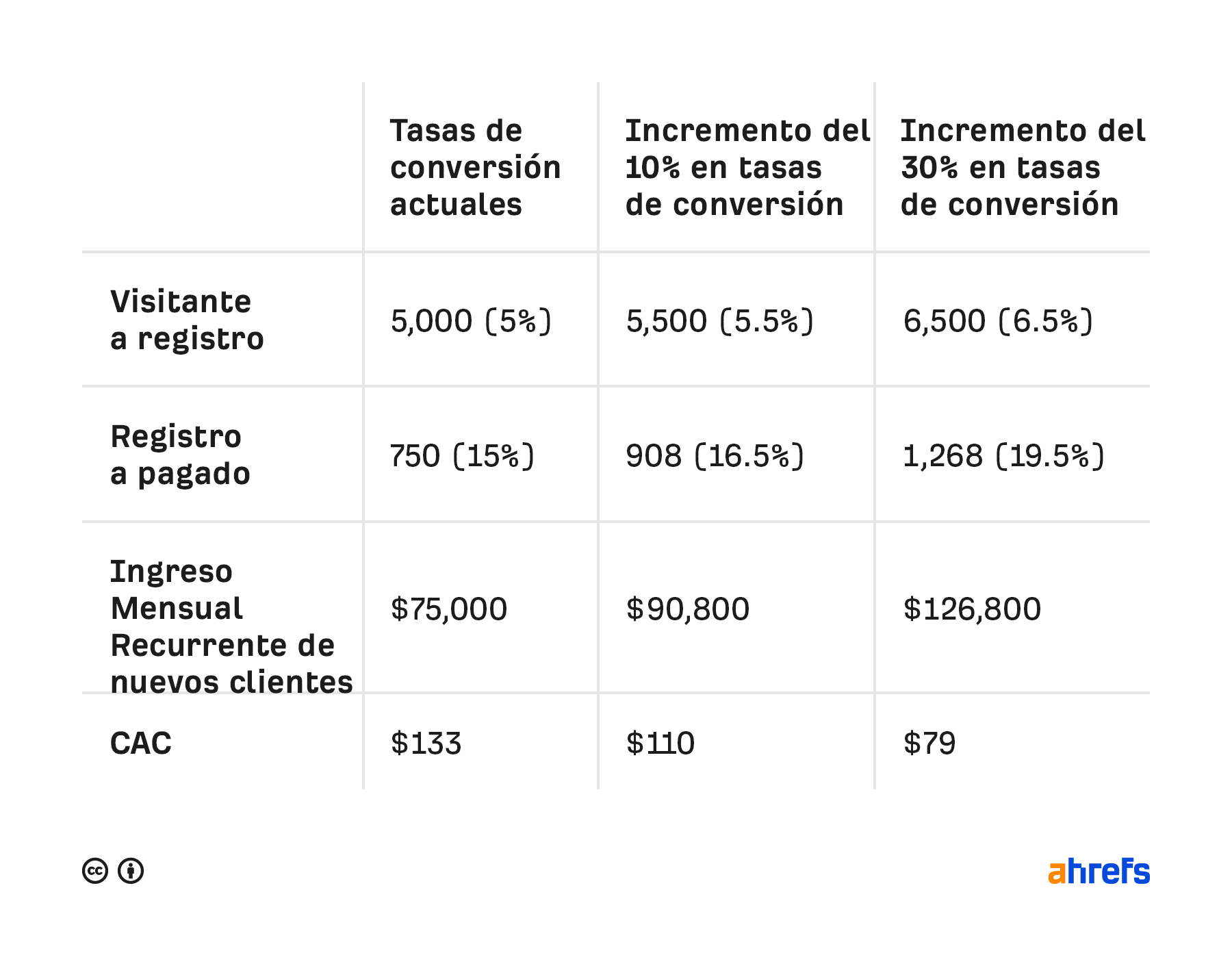 En este caso simplificado puedes ver cómo el incremento de tu tasa de conversión influye en los ingresos y el CAC: