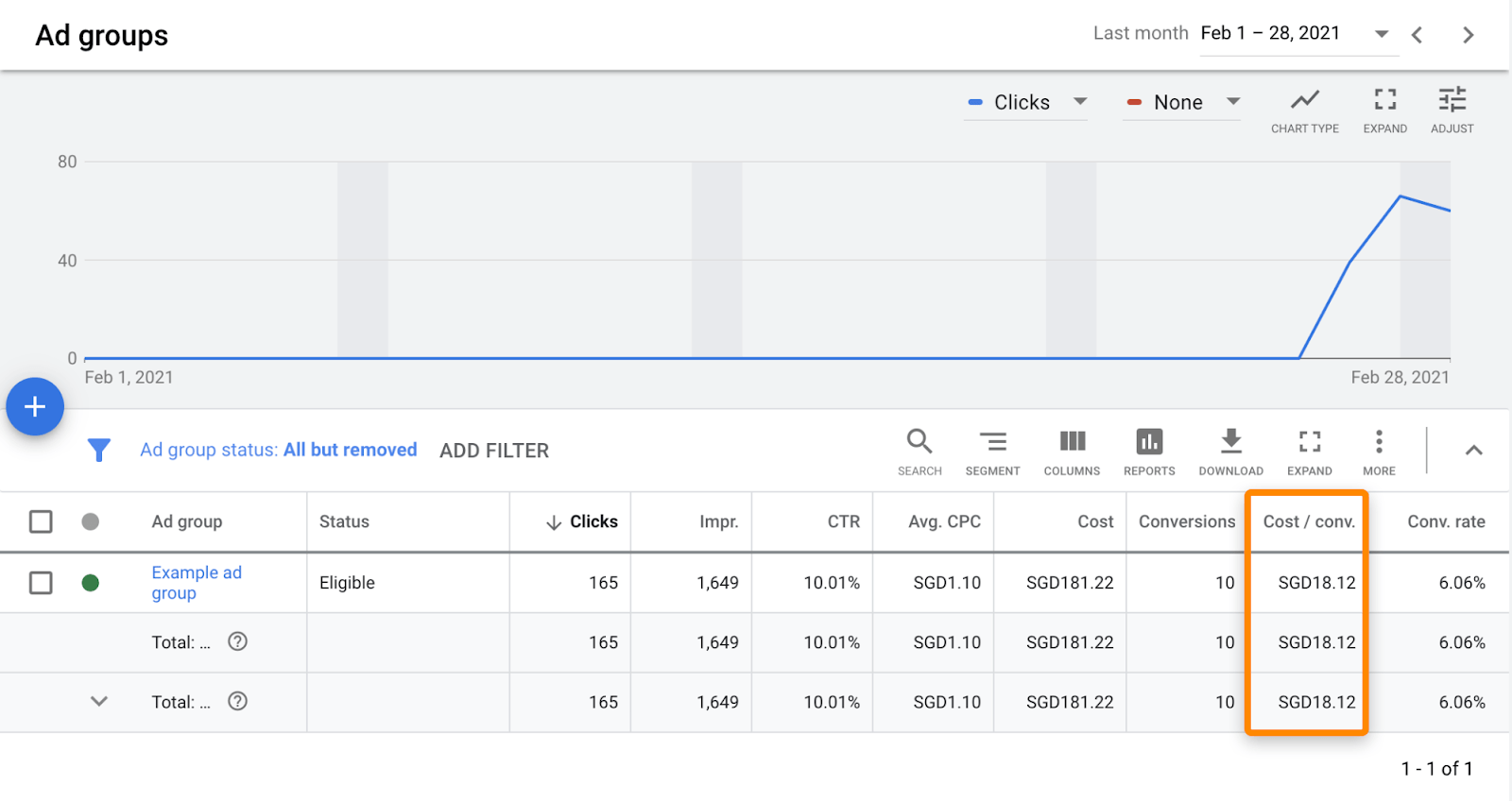 Por otro lado, en lo que respecta a canales de performance, Google Ads incluso tiene un equivalente al CAC integrado. Se llama Coste Por Conversión (Cost Per Conversion):