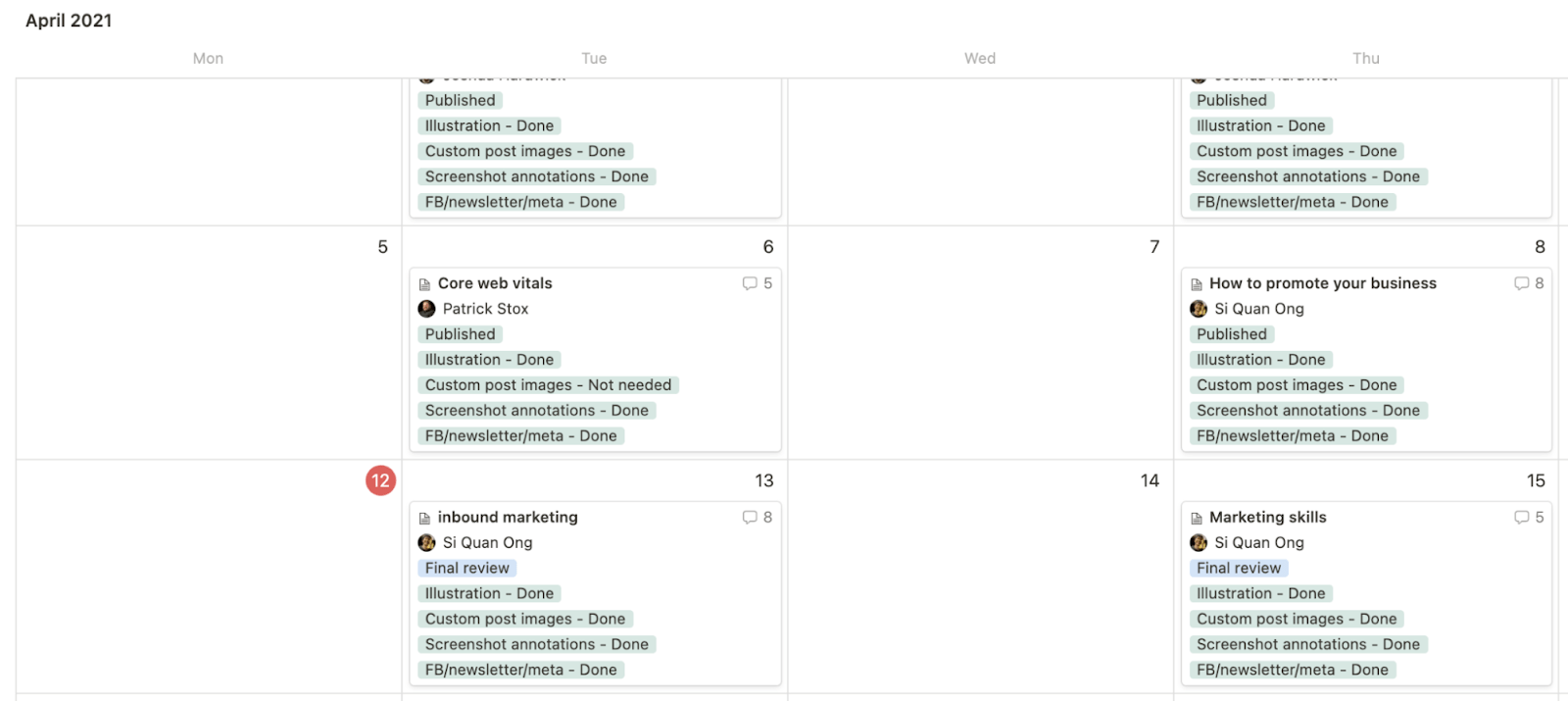 Hay muchas partes móviles involucradas en la creación de contenido y el calendario editorial mantiene a todo el mundo en la misma página. Puede que necesites trabajar con un ilustrador para un post del blog, decirle a tu equipo de redes sociales que promocione nuevo contenido y gestionar entregas de freelances y autores invitados: un calendario editorial te ayuda a dividir cada pieza en sus componentes individuales y a asignarlos a personas específicas con fechas de entrega claras.