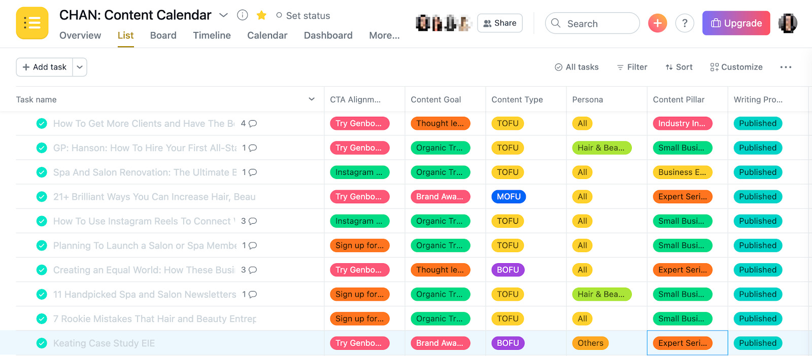 Una herramienta básica de calendario, como una hoja de cálculo, puede no tener suficiente espacio para listar toda esta información en un único espacio, mientras que software especializado (Asana en mi ejemplo) está diseñado para ayudarte a añadir cada sub-tarea individual. Si eliges mantener tu calendario sencillo, siempre puedes listar todas las subtareas en otra parte y dirigirte a ellas cuando las necesites.