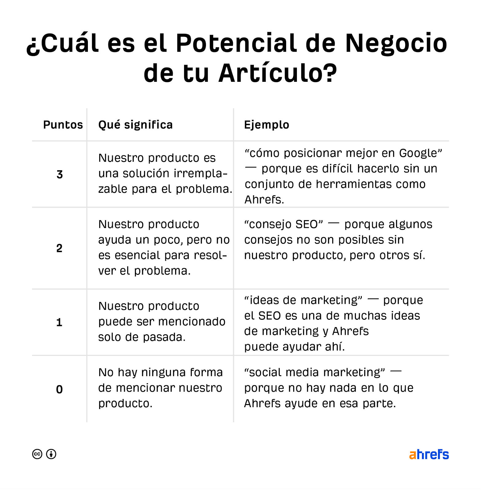 - Priorizamos temas en base a su “potencial de negocio”. Les asignamos una puntuación de 0 a 3, dependiendo de cómo de fácil sería hablar de Ahrefs en una pieza dada: