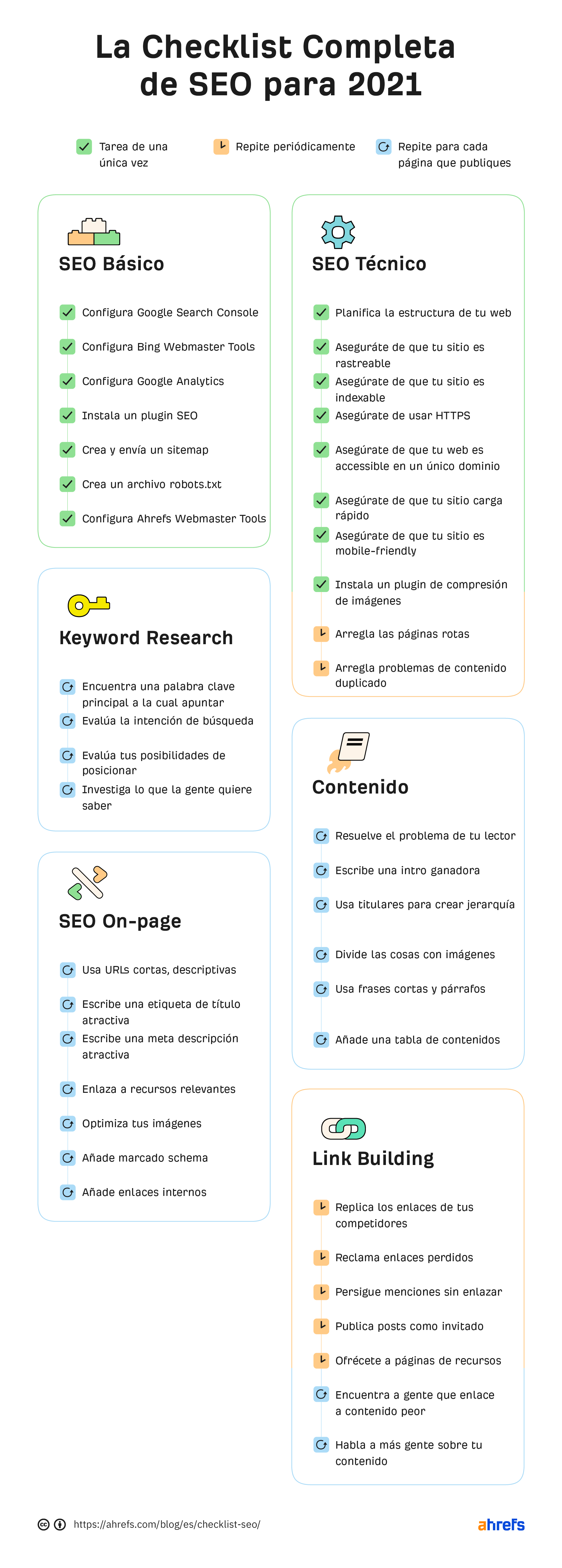 Esta estructura quiere decir que no necesitas recorrer toda la checklist hoy. Haz primero las tareas de una sola vez, después las periódicas y después completa las tareas recurrentes cada vez que publiques una nueva página.