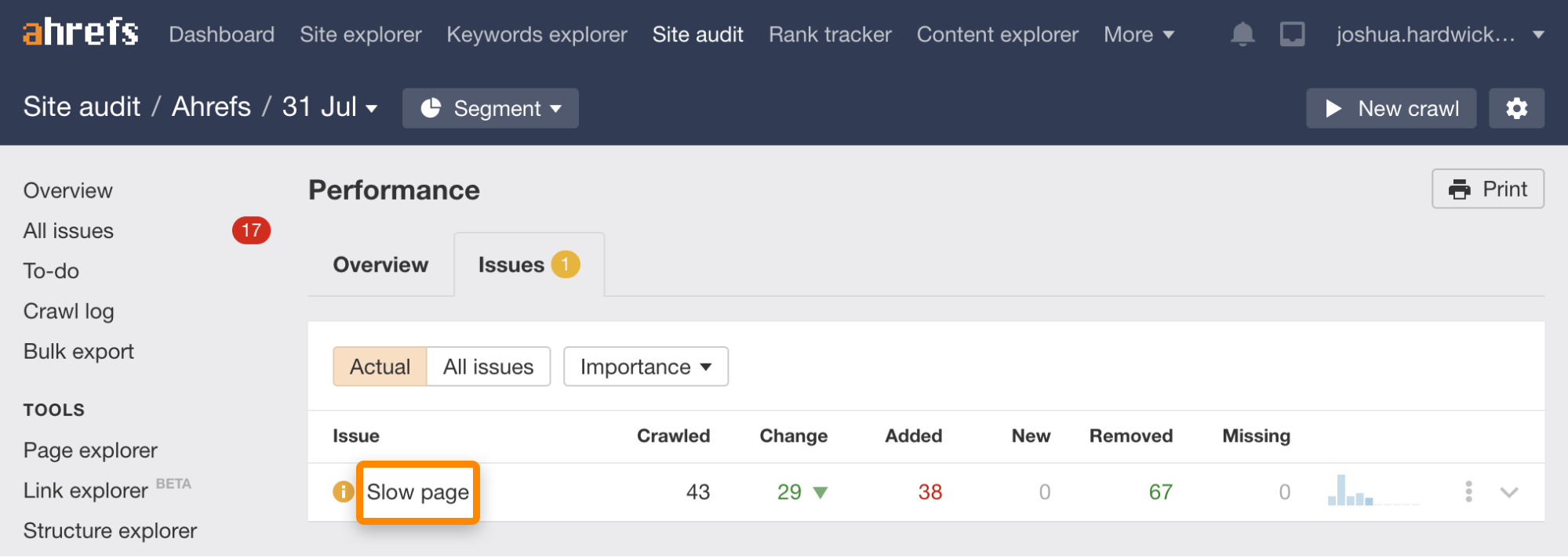 Sin embargo, estas herramientas solo pueden comprobar una página cada vez. Para comprobar todas tus páginas, rastrea tu sitio con el Site Audit de Ahrefs. Verás las páginas lentas marcadas en el informe de Performance (rendimiento).