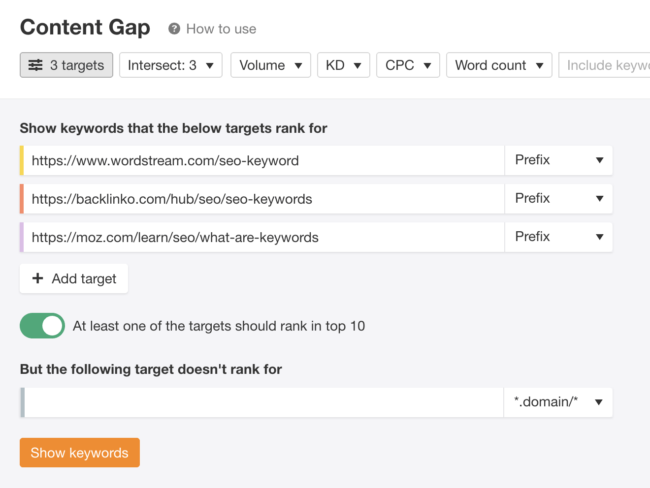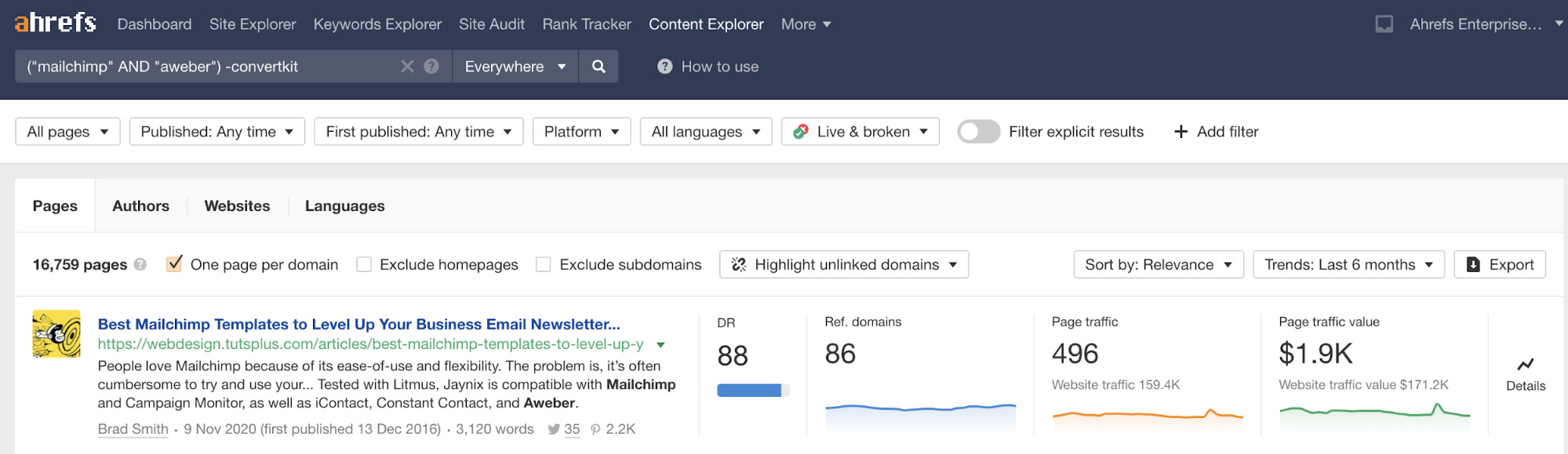 Esto buscará en nuestra base de datos de más de 7.000 millones de páginas las webs que mencionan a tus dos competidores, pero no a ti.
