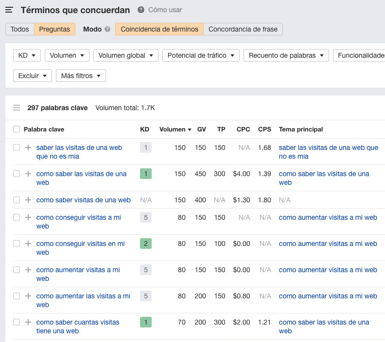 Ya que las palabras clave de la “fase de Descubrimiento” son sobre todo informativas, vamos a activar el botón de Preguntas.