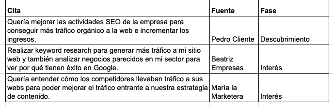 Por ejemplo, pongamos que entrevistamos a algunos de nuestros clientes de Ahrefs. Leyendo las transcripciones nos dimos cuenta de que una frase que se repetía de forma habitual era “queríamos averiguar cómo posicionar en Google por más palabras clave relacionadas con nuestro negocio”. Ya que vendemos un conjunto de herramientas SEO, podríamos incluir estos comentarios bajo la categoría de “Interés”.