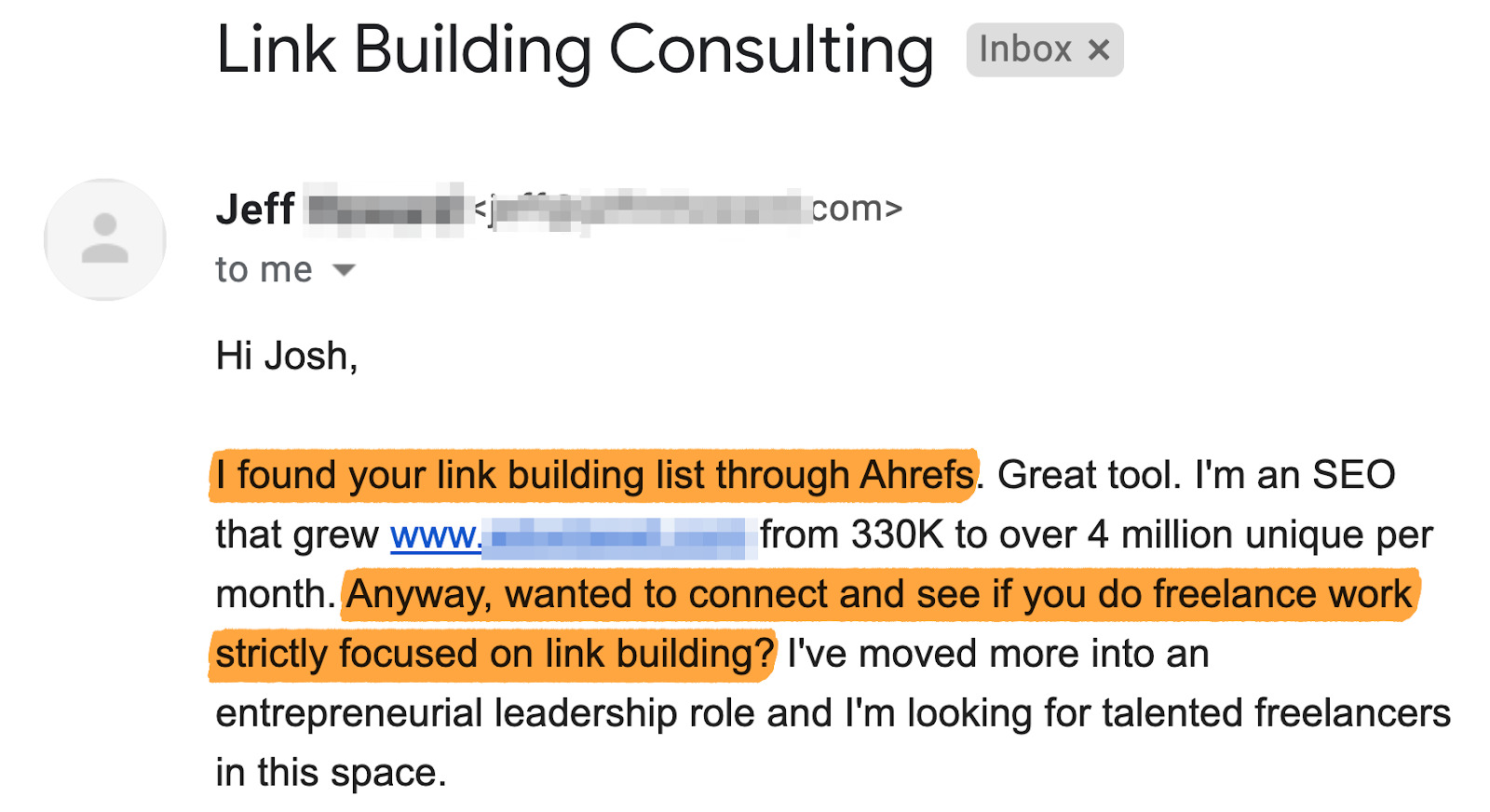 El guest posting es otra táctica que usé con éxito para atraer clientes, como puedes ver en este email: