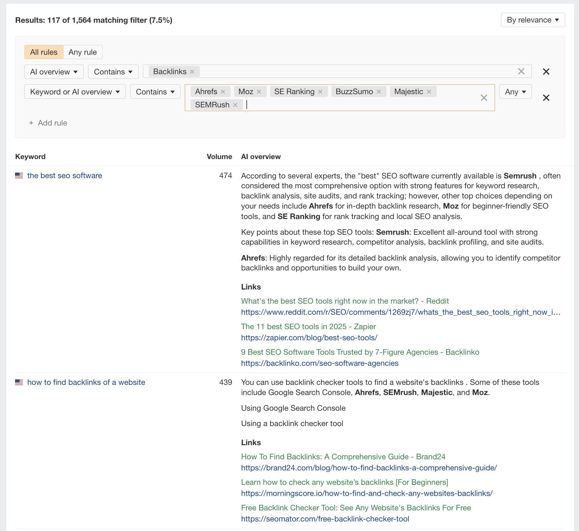 Mantén controladas las menciones de tu marca, no solo en las palabras clave que devuelven una IA Overview, sino en las propias IA Overviews, utilizando el Brand Radar de Ahrefs.