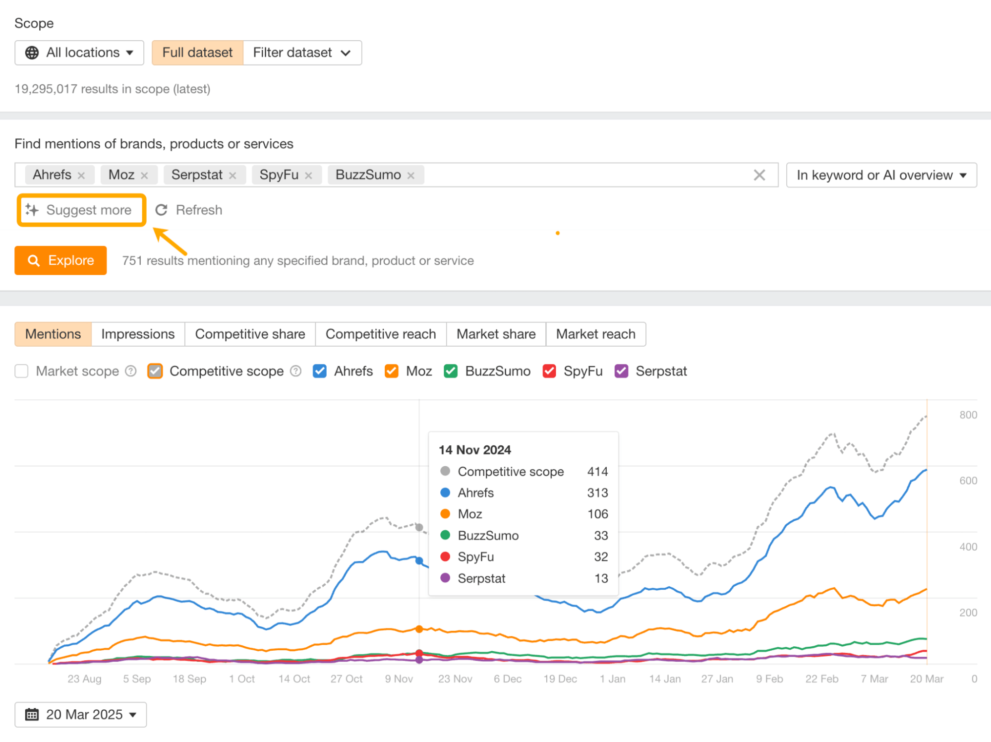 Brand Radar puede generar tus competidores utilizando IA, con un clic en el botón “Sugerir más”.