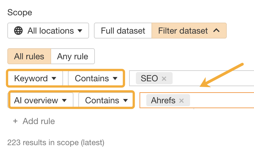 - Establece un filtro de “Palabra clave” para los temas seleccionados (en este ejemplo he seguido el nombre de la marca Ahrefs y cualquier error ortográfico).