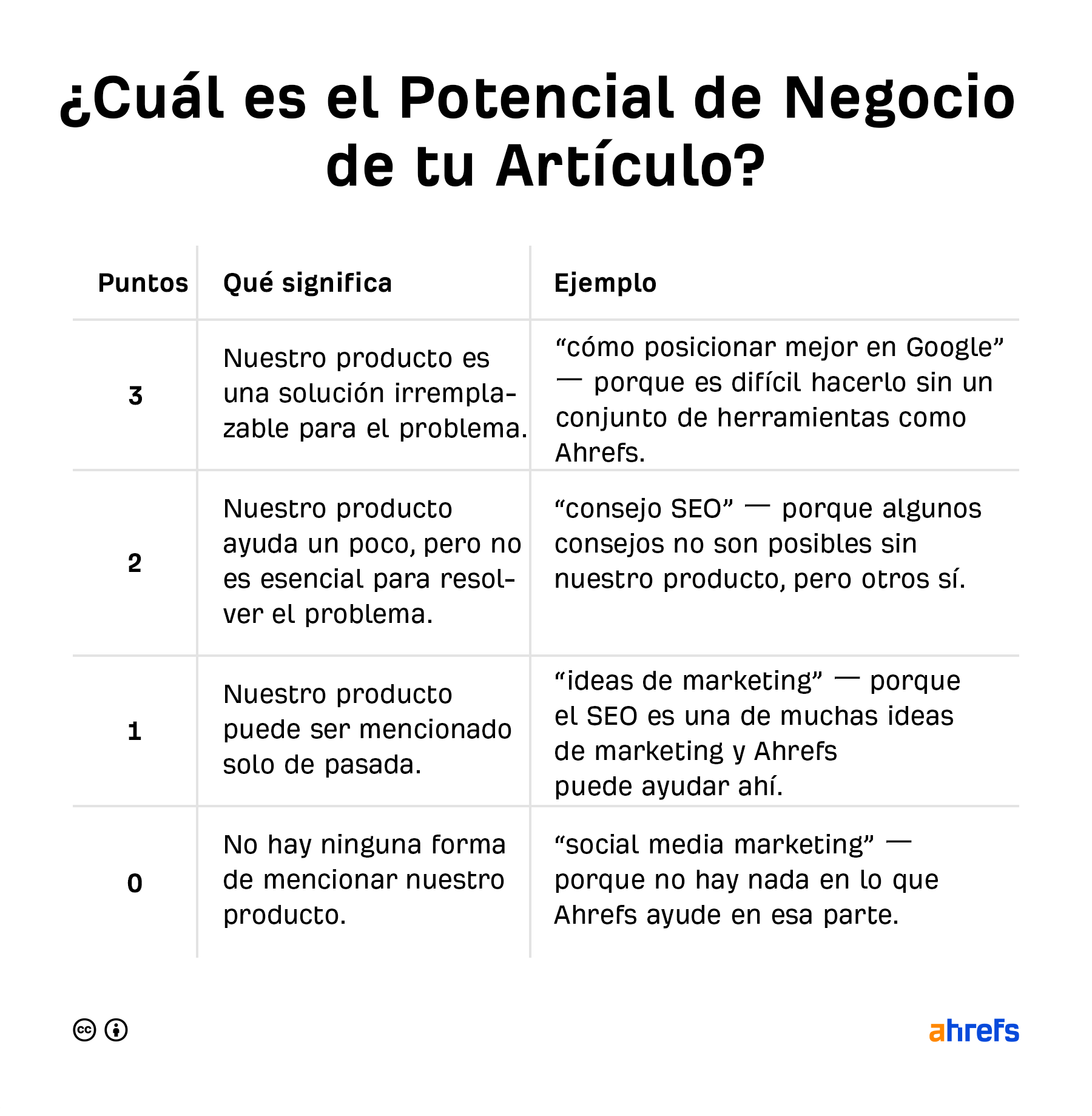 Revisa la lista y ordena los temas en base a su potencial de negocio. Aquí está el gráfico que usamos en Ahrefs.