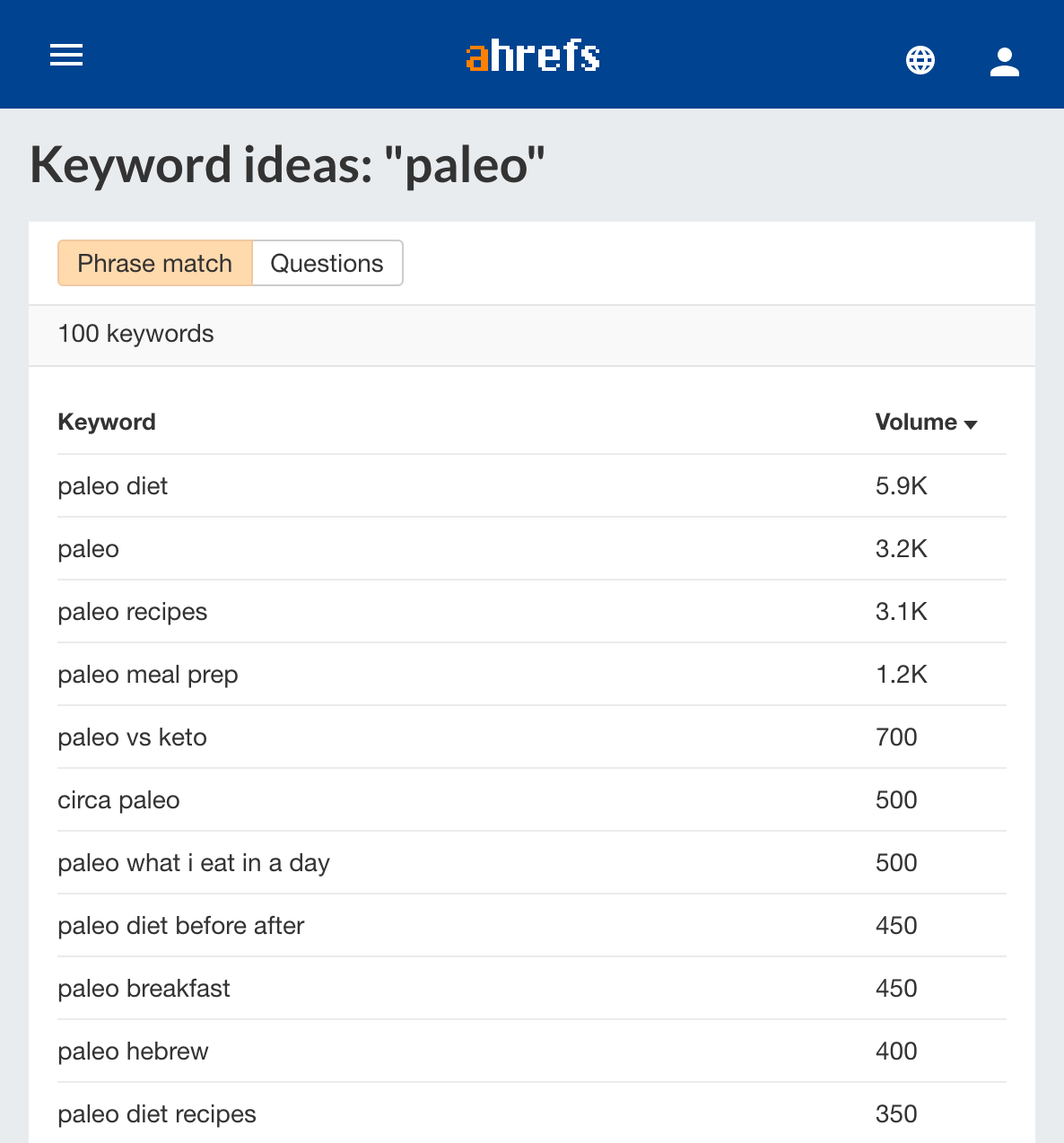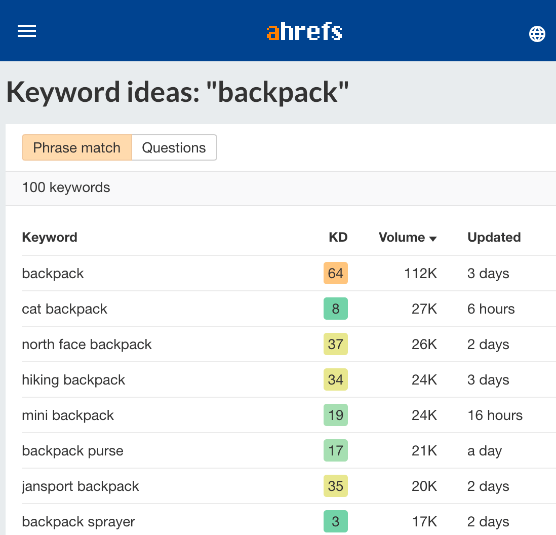 Para encontrar con quién te están comparando tus clientes, introduce el nombre de tu marca en Keywords Explorer de Ahrefs, después ve al informe de “Phrase match” (concordancia de frase).
