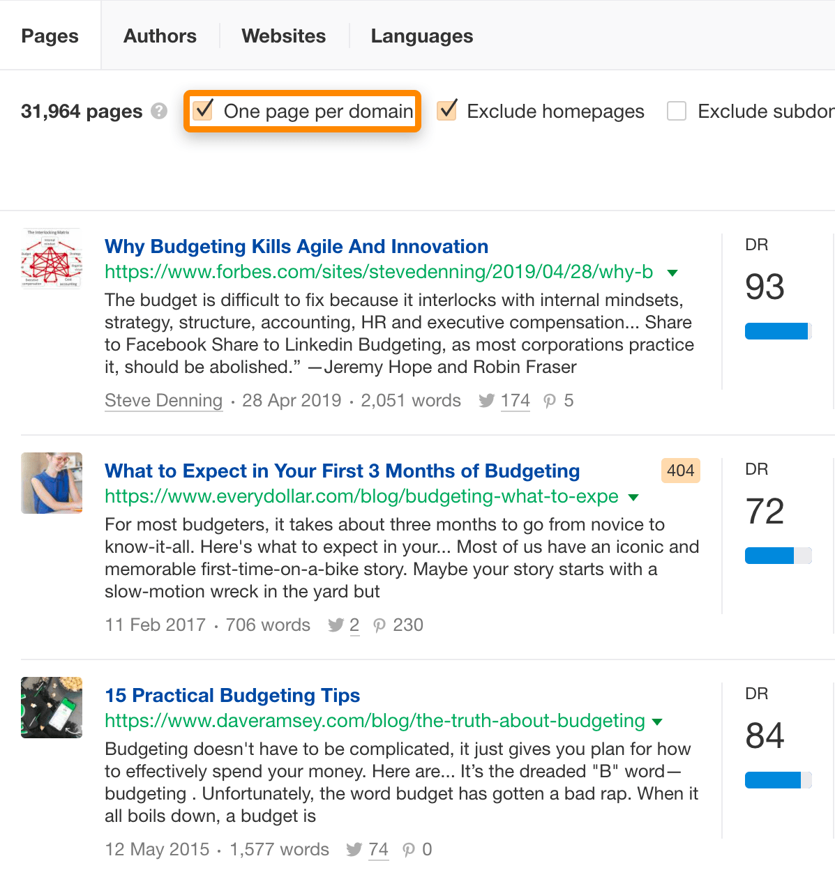 Puedes acotar la lista enfocándote en blogs que sean “de tu nivel”. Establece el filtro de Domain Rating entre 21-70 aproximadamente para encontrar estos sitios.