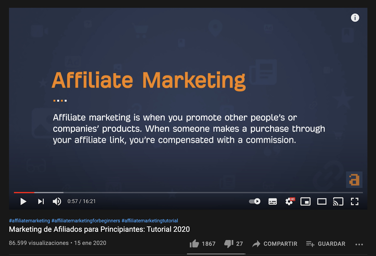 Por ejemplo, nuestro vídeo sobre marketing de afiliados recibió más de 86.000 visualizaciones: