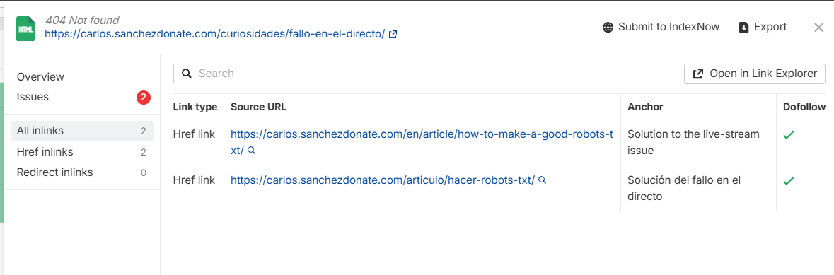 Lo malo de esta herramienta es que pese a ser gratuita no te dice desde todas las páginas en las que se enlaza a esa página para su posterior corrección, solo te indica alguna, por lo que el reporte es incompleto.
