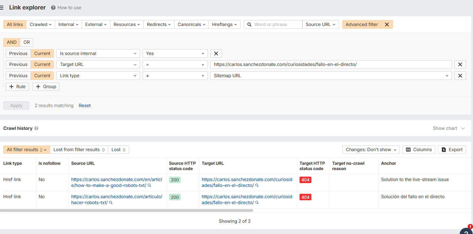 En Ahrefs lo puedes hacer de forma bastante intuitiva desde Site Explorer y desde Site Audit.