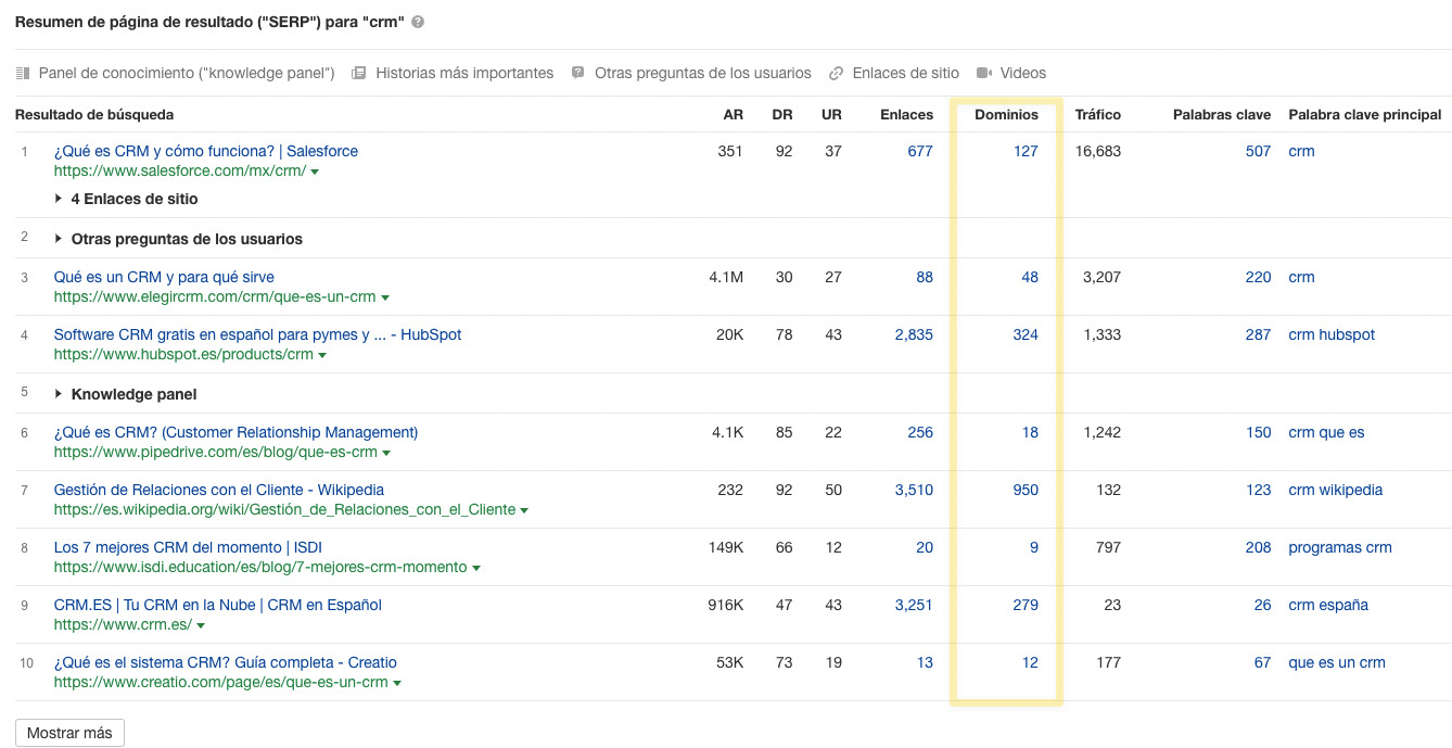 Y aunque no necesariamente estamos de acuerdo con esta afirmación, pensamos que puede ser bastante útil echar un vistazo a la autoridad que tienen las webs mejor posicionadas.