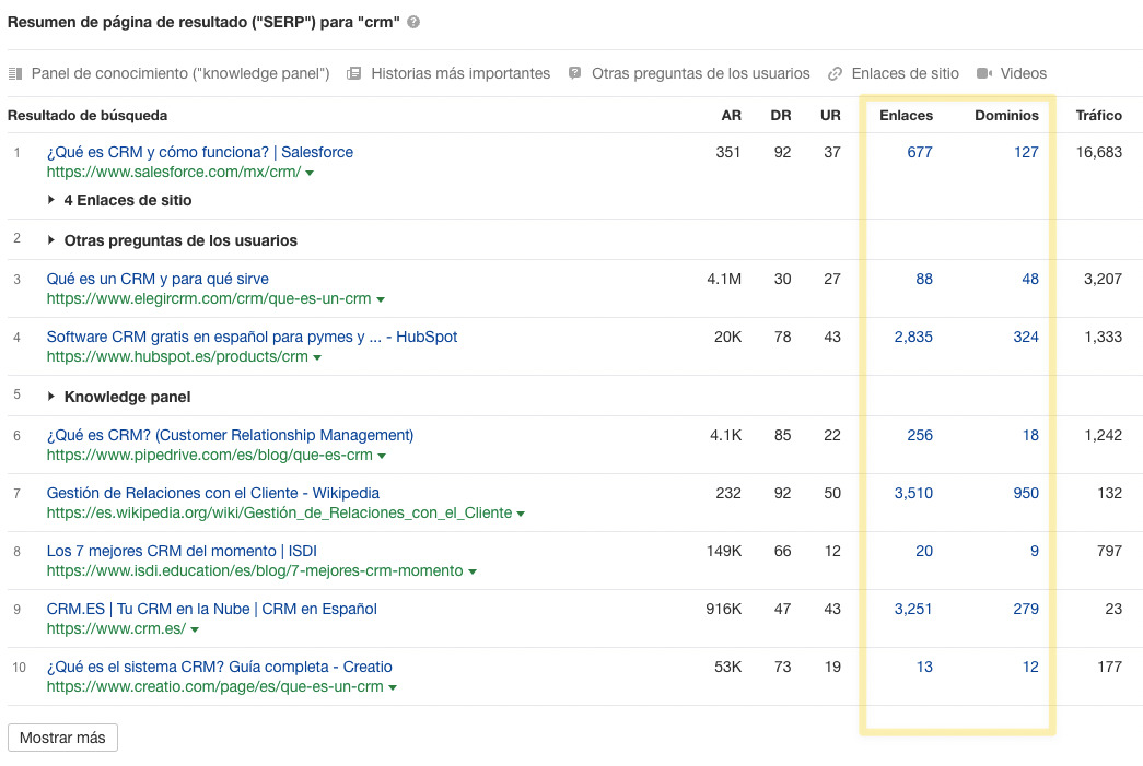 Los enlaces funcionan como votos que le dicen a Google que una página dada es más valiosa que otra del mismo tema. Así que, como regla general, si quieres posicionar en el top 10 de resultados de búsqueda de una keyword dada, tendrás que conseguir tantos (o más) enlaces que las páginas que actualmente están entre las mejor posicionadas.