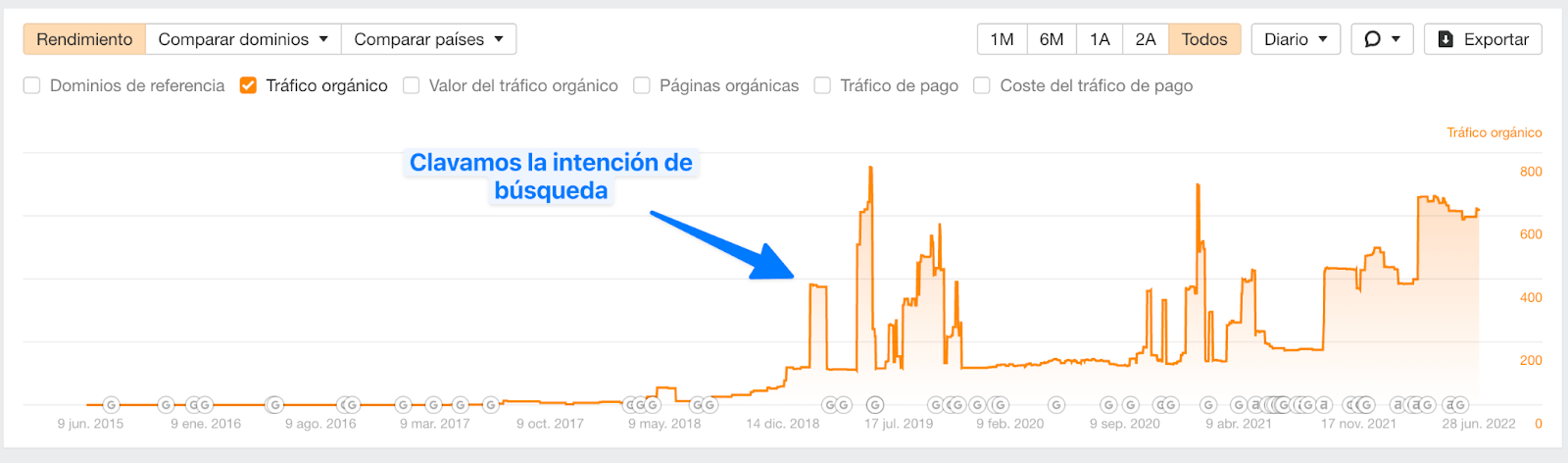 Y, por favor, no te asustes a la hora de apuntar a palabras clave con una puntuación de KD elevada. Muchas de las palabras clave con puntuación KD de más de 70 en las que hoy nos posicionamos nos llevaron más de cuatro o cinco reescrituras, mucha promoción y muchos años de paciencia hasta que llegamos ahí. Así que cuanto antes “ataques” a keywords con elevada puntuación de KD en las que quieres posicionarte, antes lo conseguirás.