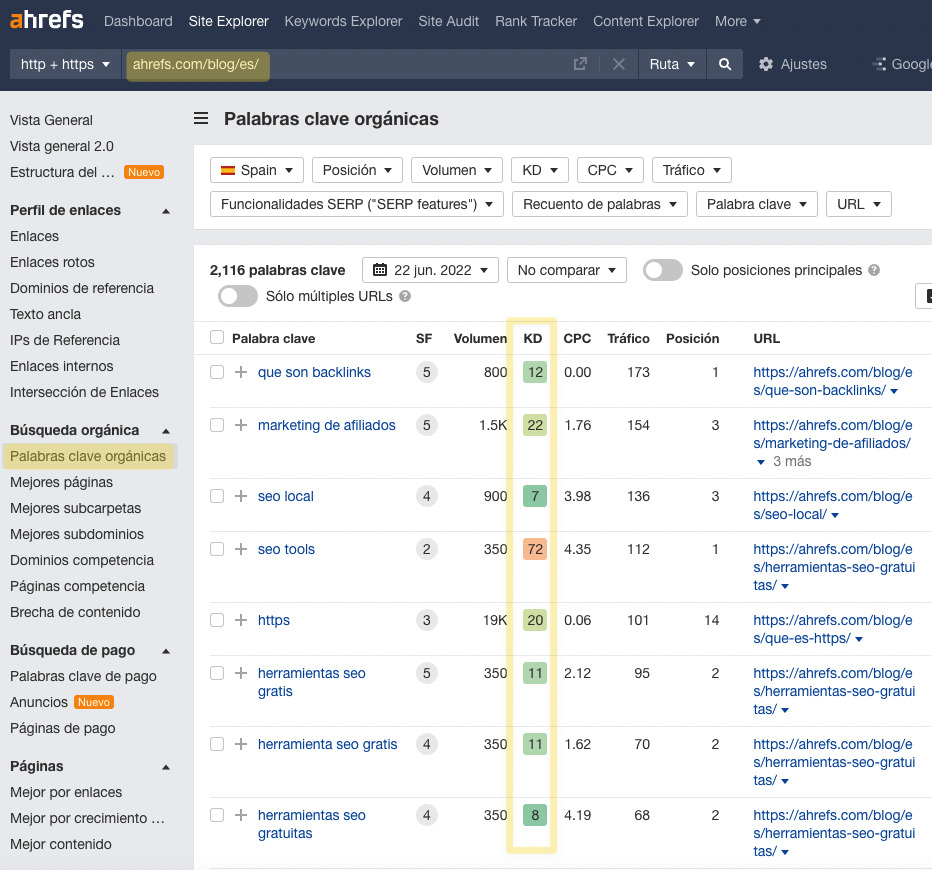Un buen ejercicio que te puede ayudar a acostumbrarte a la métrica de KD de Ahrefs es revisar las puntuaciones de KD de palabras clave en las que ya se posicione tu sitio web.