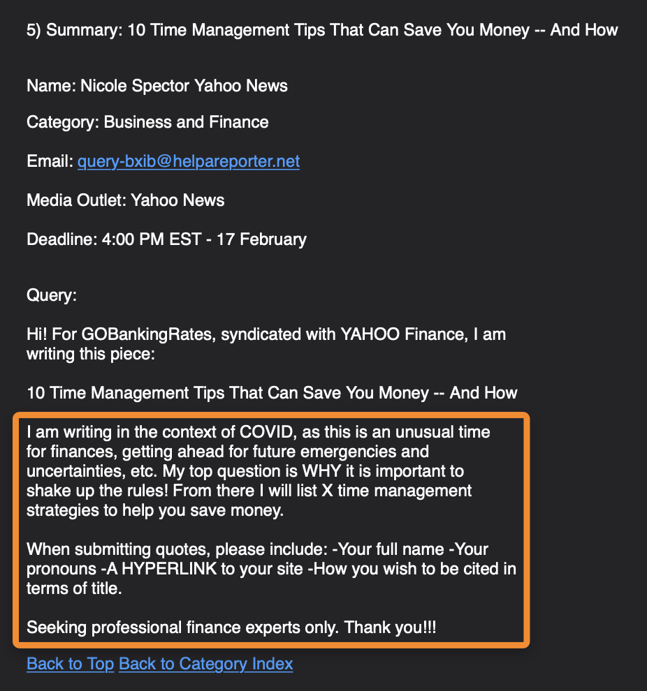 Todo lo que necesitas es suscribirte a un servicio de peticiones de medios en servicios como HARO, Sourcebottle, ResponseSource, o JournoRequests. En español, también existe Reportaro.