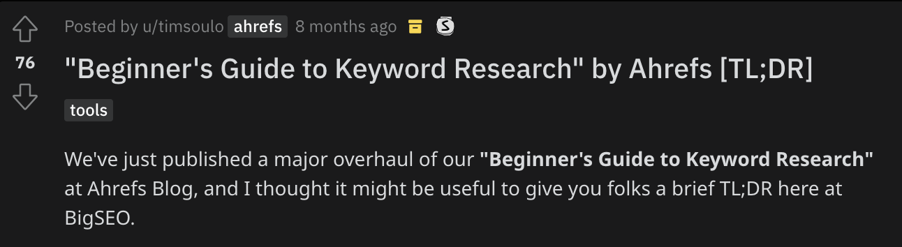 Bien, el artículo que presenté era una de mis mejores piezas de contenido. Cuando compartí una versión TL;DR (demasiado largo, no leer, es decir, un resumen) en el subreddit /r/BigSEO, recibió cerca de 80 votos y una medalla de plata (algo que me aseguré de mencionar en mi email de contacto por aquello de laprueba o demostración social).
