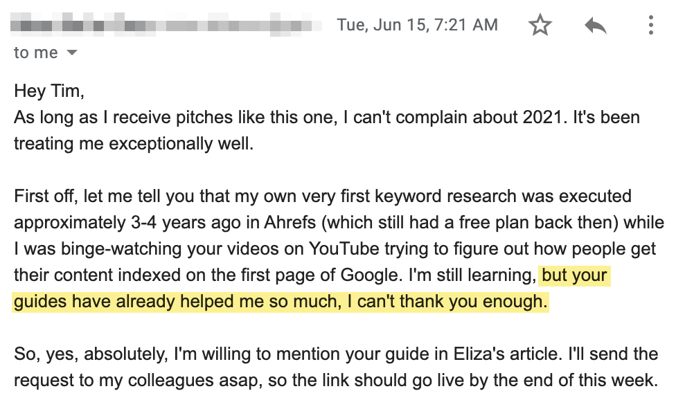 Enlacé a tu post en el artículo nuestro por el que preguntabas. Feliz de amplificar el alcance de Ahrefs (somos grandes fans en caso de que no te hayas dado cuenta 😉 Gracias por el email de contacto en frío altamente personal. ¡Buena suerte!