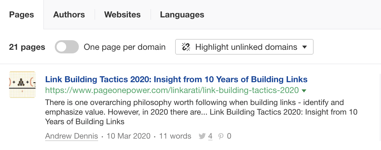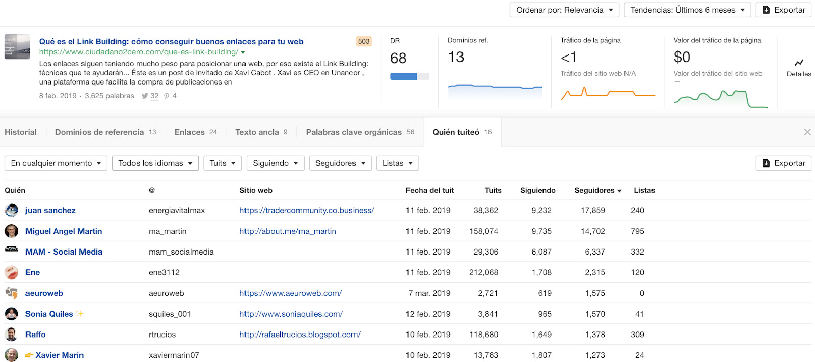 Echa un vistazo a los autores que más hablan sobre tu tema. Nuestro propio Joshua Hardwick tiene un impresionante total de 14 páginas con “link building” en el título. Lo más posible es que sea un experto en el tema. Y con más de 6.000 seguidores solo en Twitter, probablemente tenga una audiencia activa.