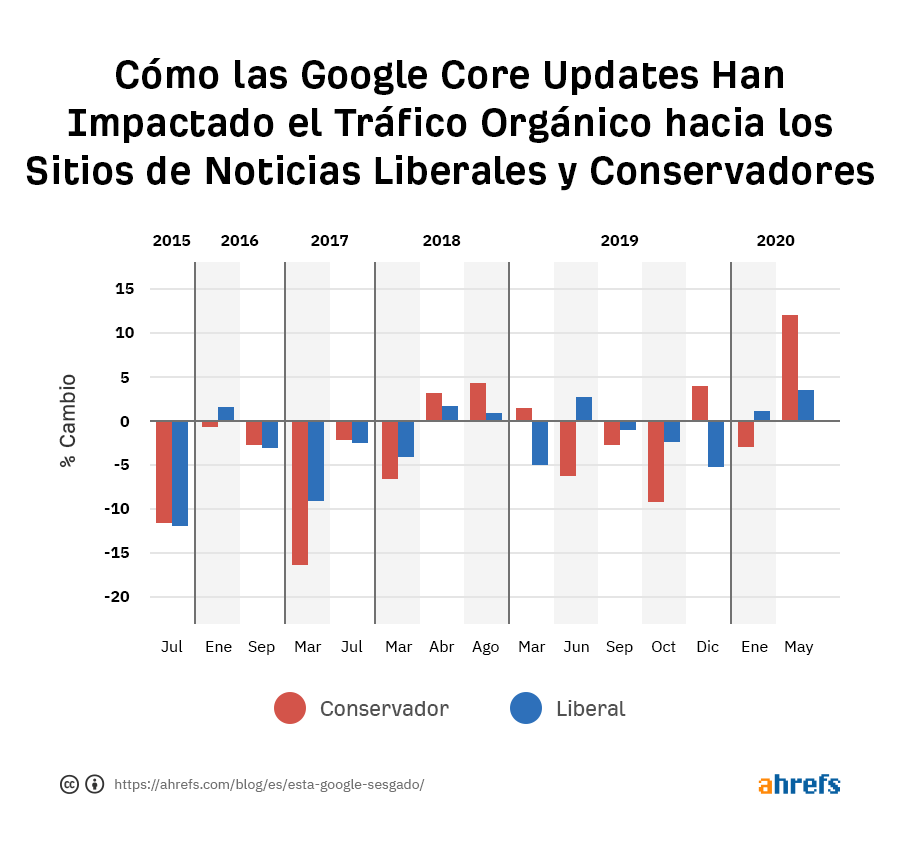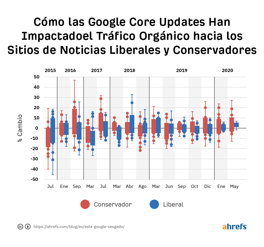 Google realiza cientos de ajustes en sus algoritmos de clasificación cada año. La mayoría de estos pasan desapercibidos porque son pequeños, pero de vez en cuando, hay una gran core update que afecta a un gran porcentaje de los resultados de búsqueda. Como Google nos dice las fechas de estas actualizaciones, pensamos que podríamos buscar sesgos al estudiar el tráfico orgánico a sitios de noticias Liberales y Conservadores populares antes y después de estas actualizaciones.