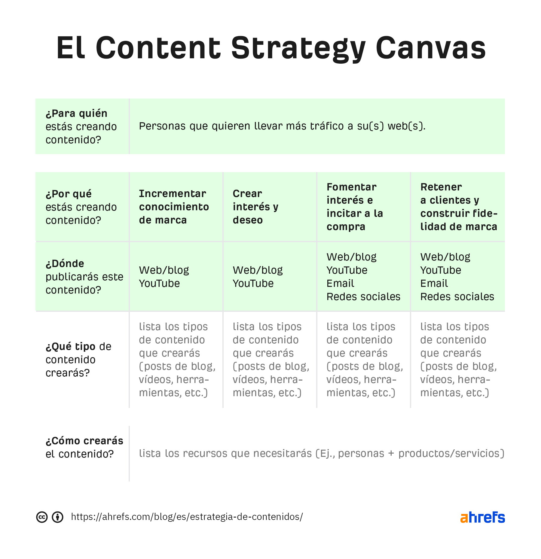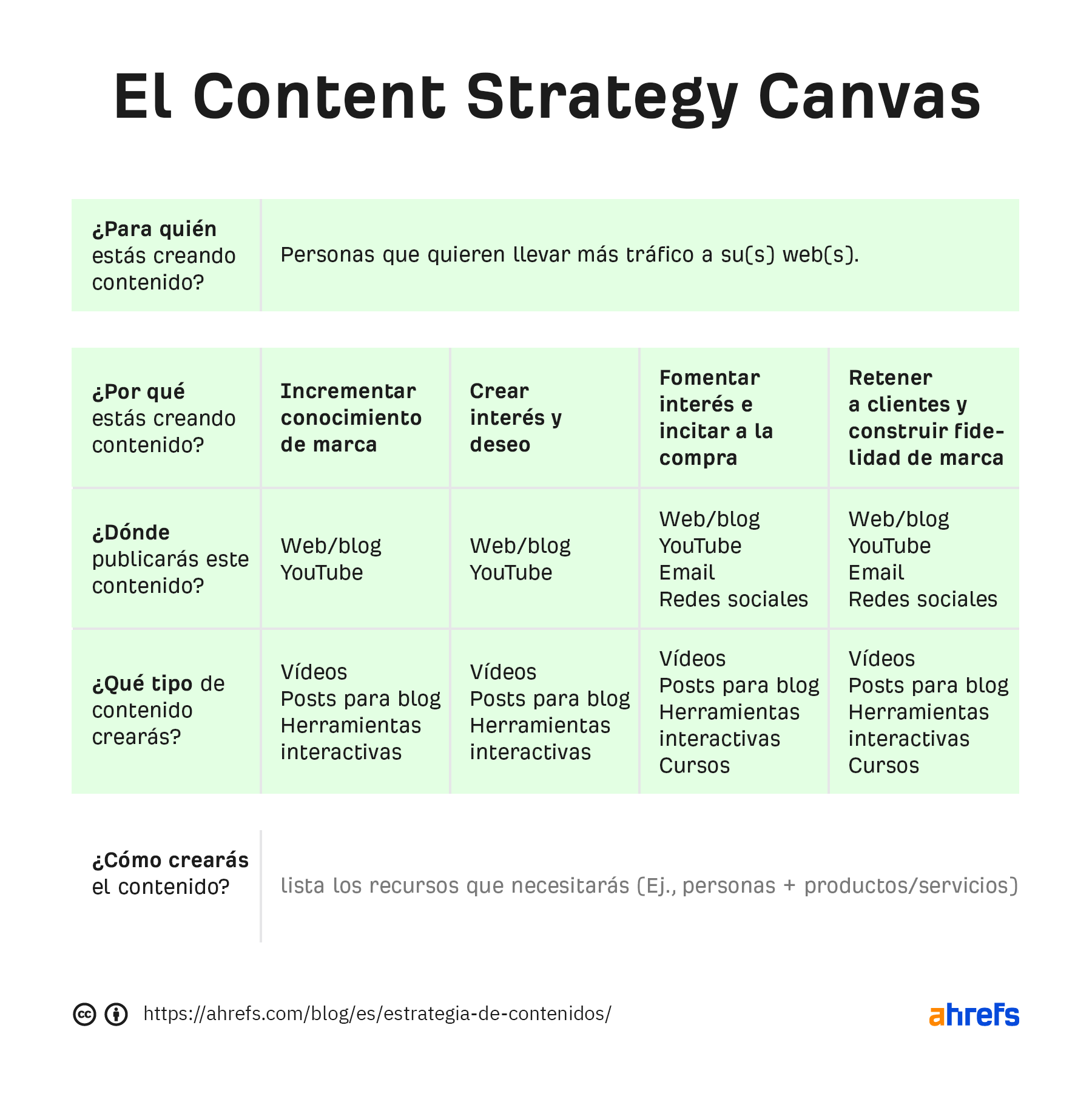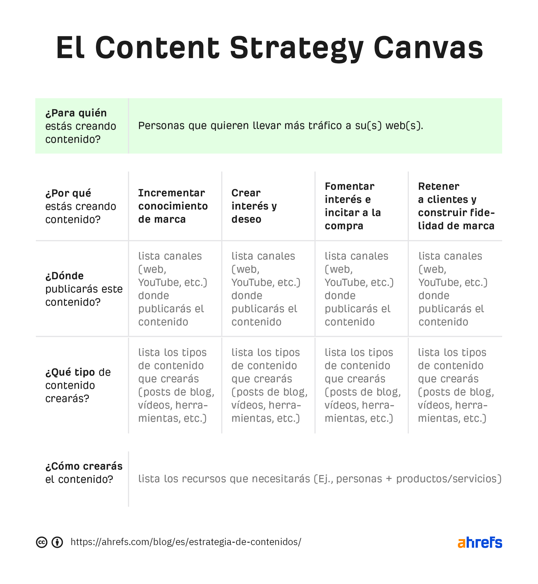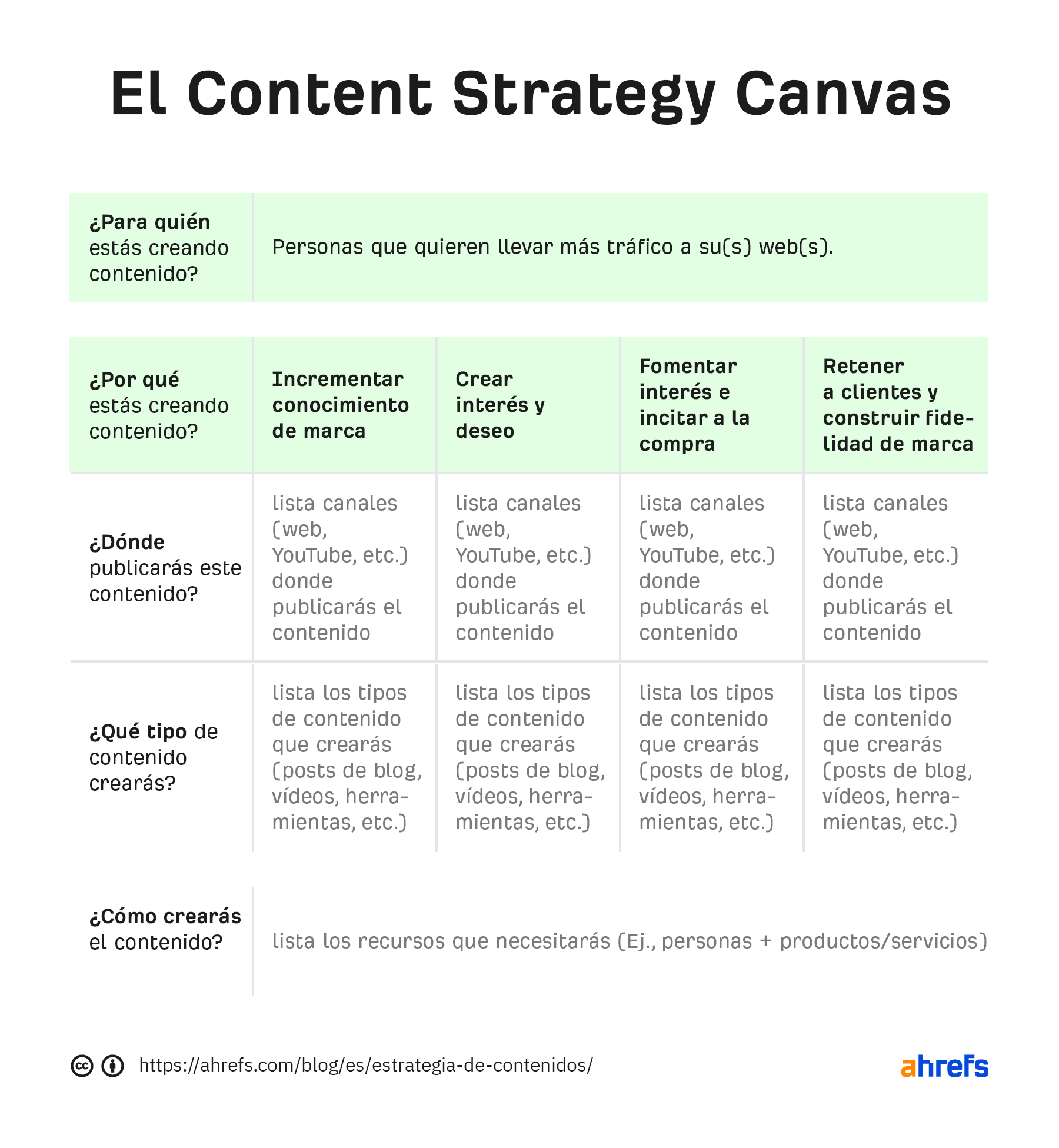 El propósito del content strategy canvas es ayudarte a crear una estrategia de contenidos básica respondiendo cinco preguntas sencillas: