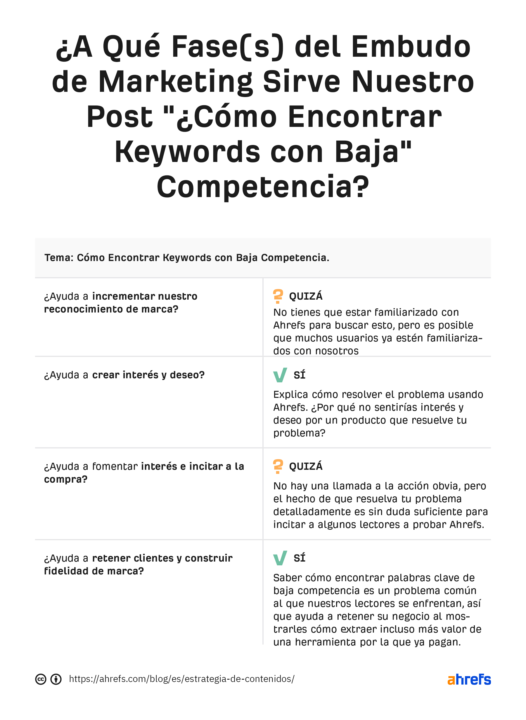 Muchos de nuestros posts en el blog son un ejemplo de esta idea en la práctica. Por ejemplo, toma un tema como “cómo encontrar keywords con baja competencia”. Este post posiblemente sirva a todas las fases del embudo de marketing en distintos grados.
